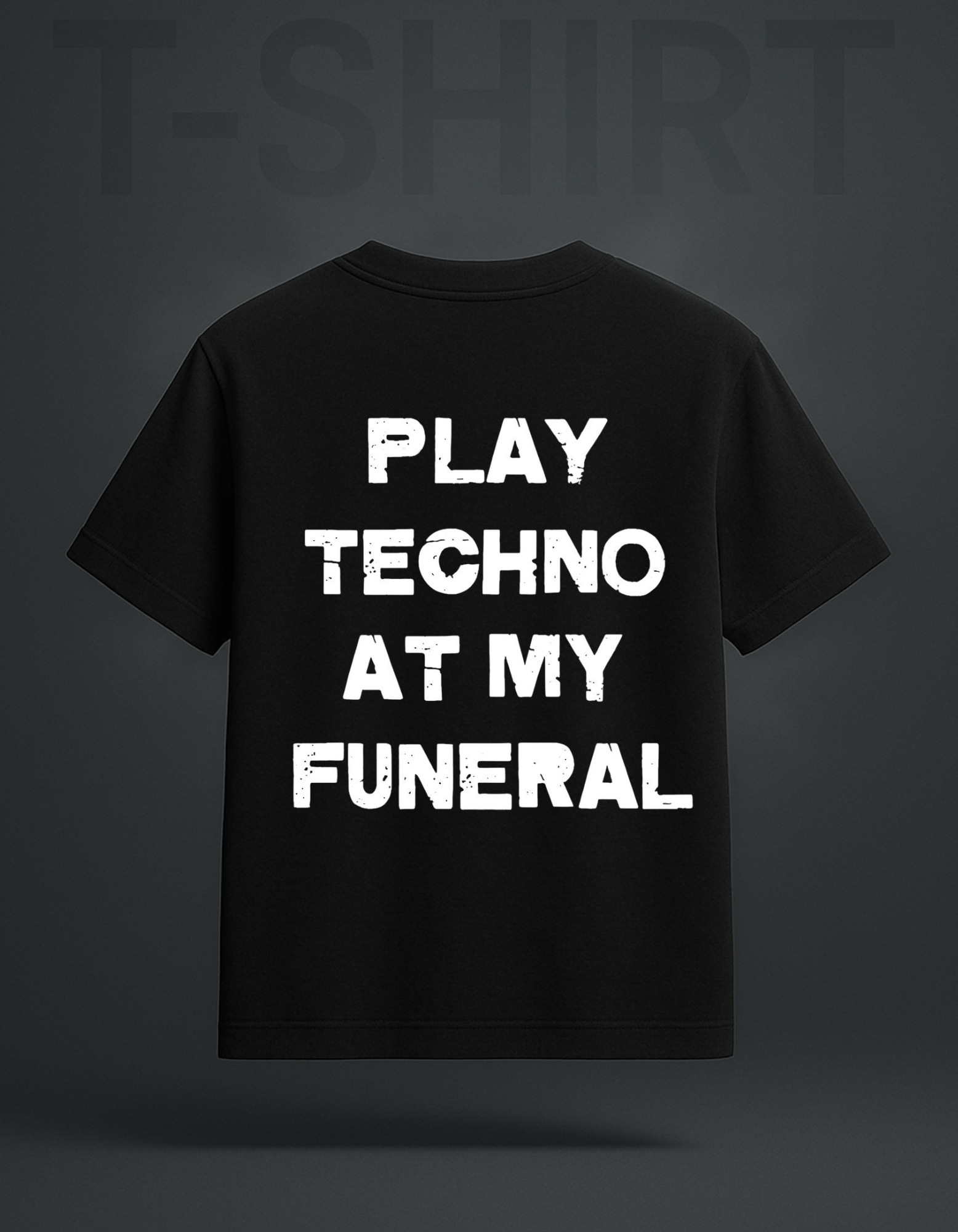 The back-print reads: "PLAY TECHNO AT MY FUNERAL"